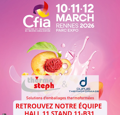Thermo Steph & Dupuis Thermoformage ont le plaisir de vous convier au CFIA Rennes 2026, qui se tiendra les 10, 11 et 12 mars 2026.